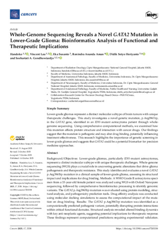 Handoko, Handoko and Lau, Vincent and Susanto, Eka and Ananda A, Renindra and Heriyanto, Didik Setyo and Gondhowiardjo, Soehartati A. (2025) Whole-Genome Sequencing Reveals a Novel GATA2 Mutation in Lower-Grade Glioma: Bioinformatics Analysis of Functional and Therapeutic Implications. Cancers, 17 (20). pp. 1-28.